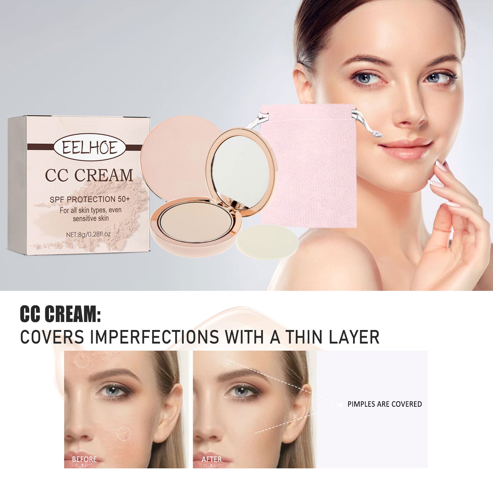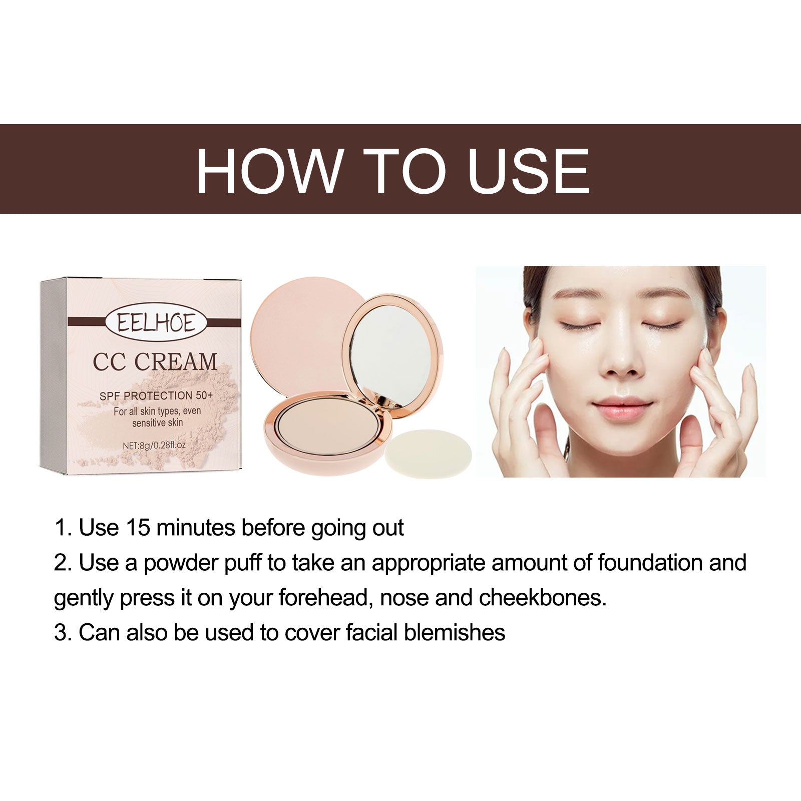 Our compact powder contains hydrogenated castor oil and palm wax. It makes it easy to create flawless HD makeup. How to use it is simple: 1. Use it 15 minutes before going out. 2. Use a powder puff to apply a proper amount of foundation to your forehead, nose, and cheekbones. 3. Can also be used to cover facial blemishes. And can be applied to all skin types, even sensitive skin can be safely used.